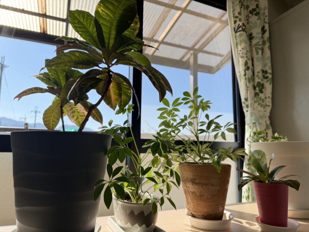 せっかくなので、窓際の日当たりの良い場所で、あしたばの観葉植物5人衆に日光浴してもらいました😆